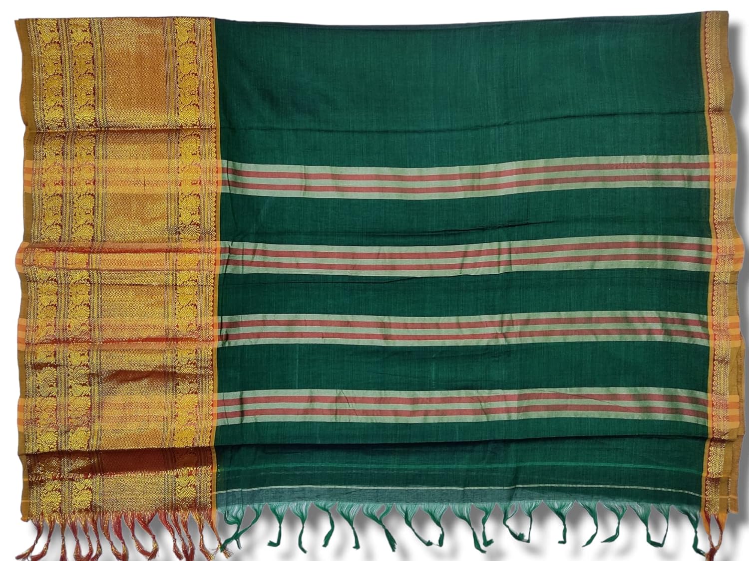 Bottle Green Narayanapet Elephant Border Pure Handloom Cotton sarees with Running blouse piece